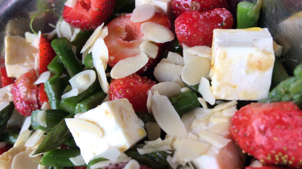 W misce mieszamy z sosem szparagi, pokrojone na kawałki truskawki i ser pokrojony w kostkę. Na wierzch sypiemy płatki migdałów i już!