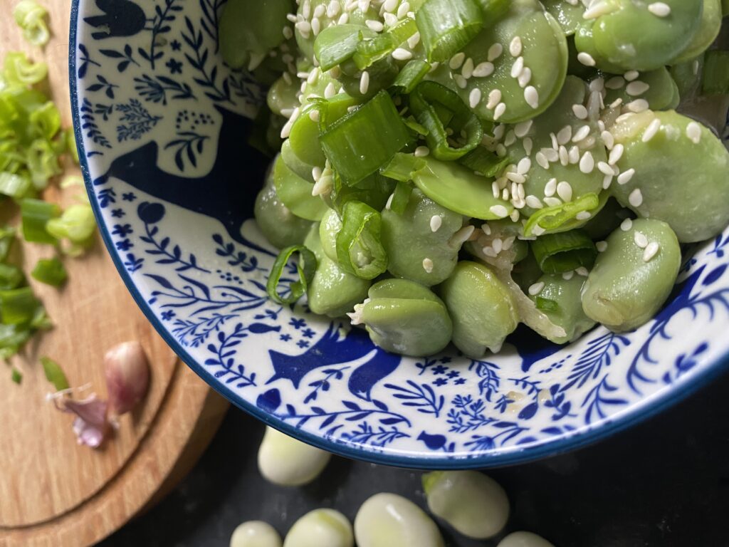 Składniki sosu mieszamy ze sobą. Jeśli chcemy zjeść na ciepło to bób w skórkach mieszamy z sosem, posypujemy posiekaną dymką (i kolendrą jeśli lubicie) i uprażonym na suchej patelni sezamem. W wydaniu na zimo bób po ugotowaniu przelewamy lodowatą wodą (to powstrzymuje proces gotowania i pozwala zachować przepiękny zielony kolor), po wystudzeniu obieramy ze skórek i mieszamy z sosem i dodatkami.